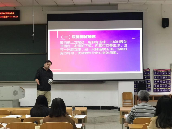本部青年教师金富巽、徐妍、晏飞、汪萍(抽签顺序)参加了比赛,并分别选取“极限飞盘”“啦啦操”“足球”“瑜伽”等项目进行了参赛。在比赛现场,四位老师分别对其课前准备工作以及授课前的热身动作进行介绍并作出了演示。同时各位老师还在课程上进行了各种有趣的课堂游戏,这大大提高了教学过程的趣味性。参赛教师们精神饱满、教态自然、课件精美、条理清晰,充分展示了青年教师的课堂风采。部门负责人表示非常重视此次赛事,多次召开专题会议,集体讨论竞赛相关事宜,一起研讨ppt的制作过程,理清比赛思路,完善比赛细节,做好充分的竞赛准备,为参赛教师的教学比赛献策献力。